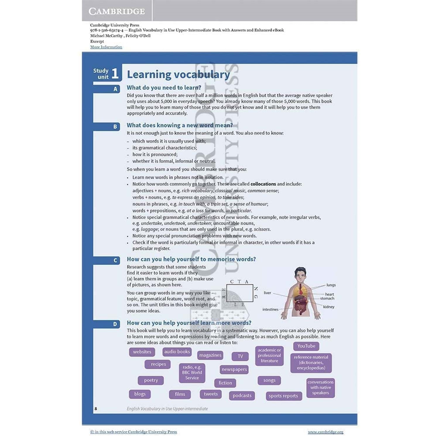 Vocabulary explanations and practice for upper-intermediate level (B2) learners of English. Perfect for both self-study and classroom activities. Quickly expand your vocabulary with over 100 units of easy to understand explanations and practice exercises. Also inside the book is a code for an ebook. This is the same as the printed book, but with audio so that you can listen to new words as well as reading them. The ebook is online for Windows and Mac users, and can also be downloaded to iPads and Android tablets.