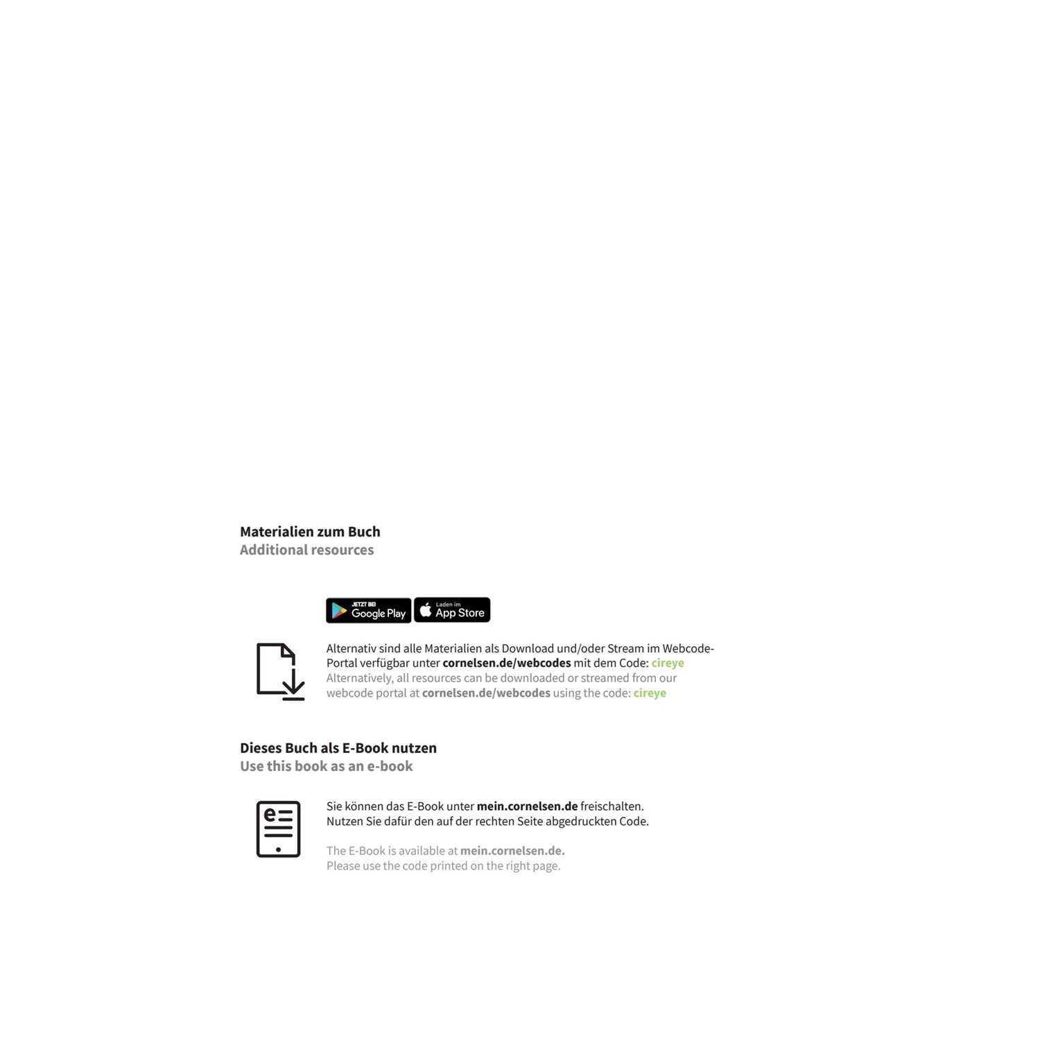Das Kurs- und Übungsbuch enthält einen eingedruckten Lizenzcode zur kostenlosen Freischaltung des E-Books auf mein.cornelsen.de. Die Audios lassen sich über Klickstellen an der Buchseite aufrufen.