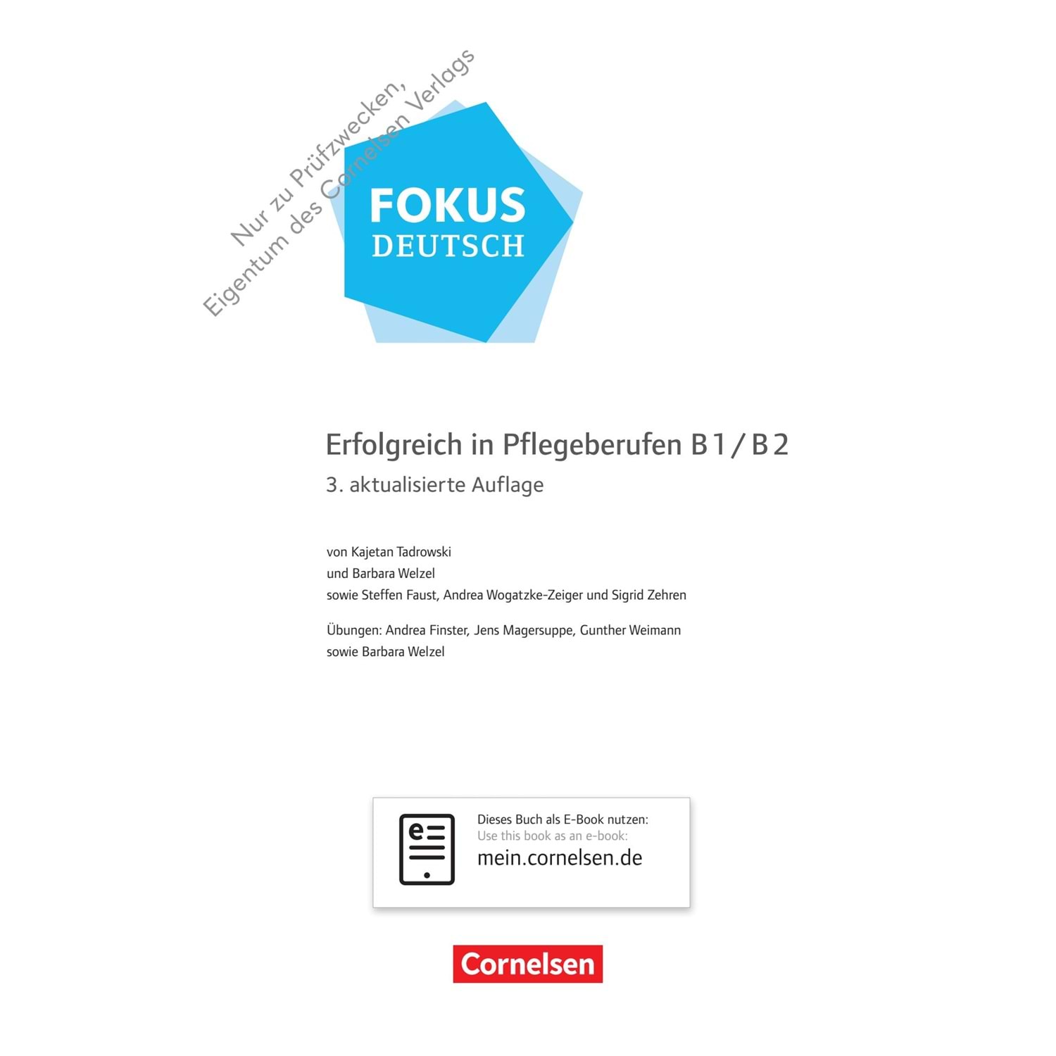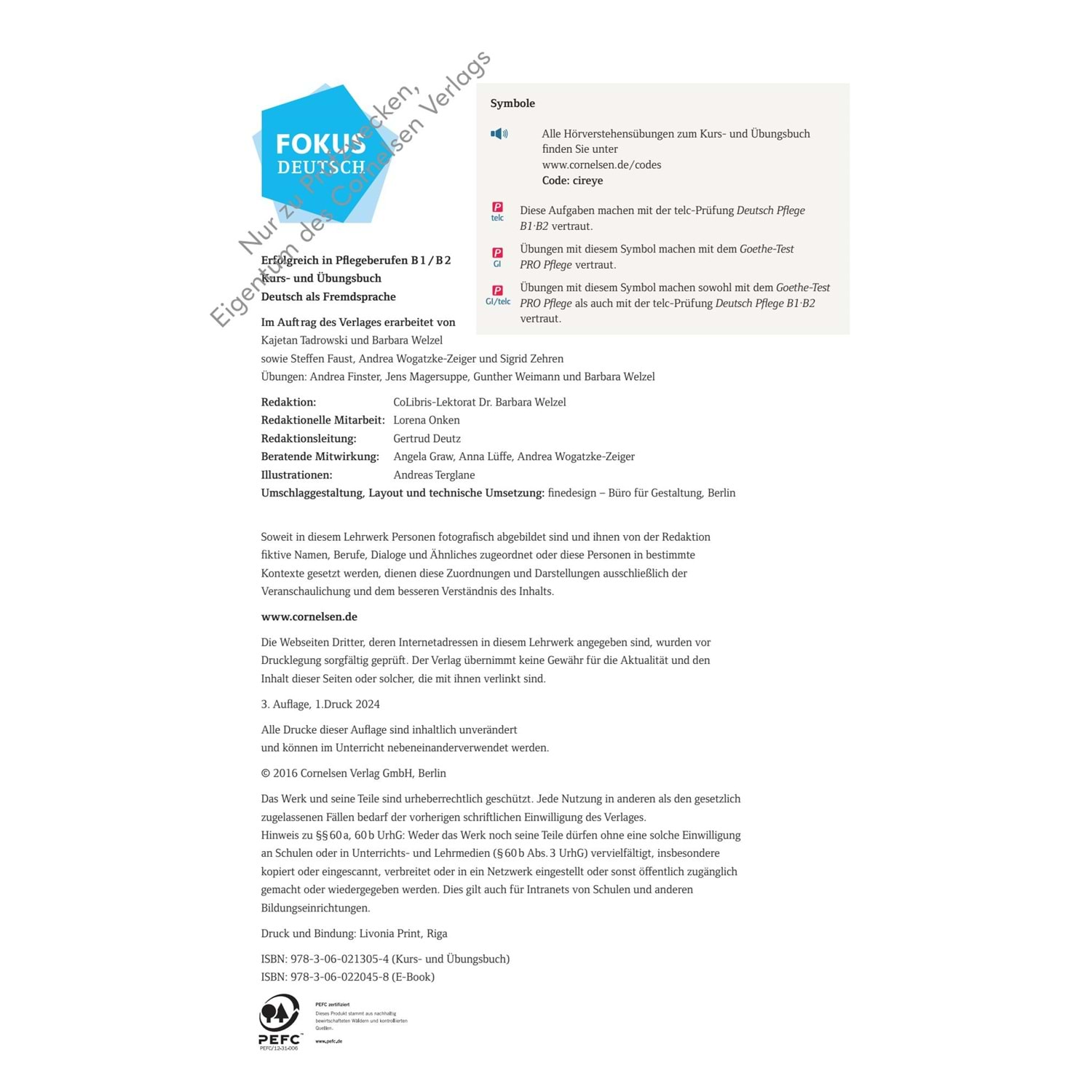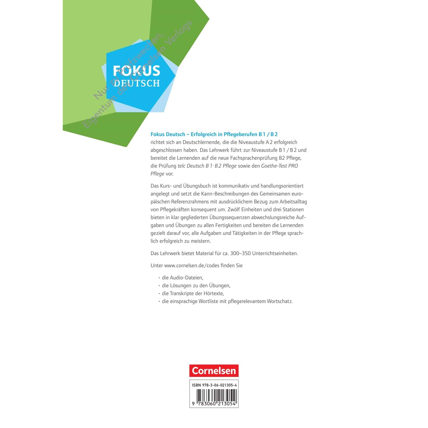 Fokus Deutsch – Erfolgreich in Pflegeberufen wiederholt und entwickelt die mündliche und schriftliche Sprachkompetenz ab Niveau A2 hin zu B1 / B2 und bereitet auf die Prüfungen telc Deutsch B1·B2 Pflege und Goethe-Test PRO Pflege sowie auf die neue Szenario basierte Fachsprachenprüfung B2 vor.