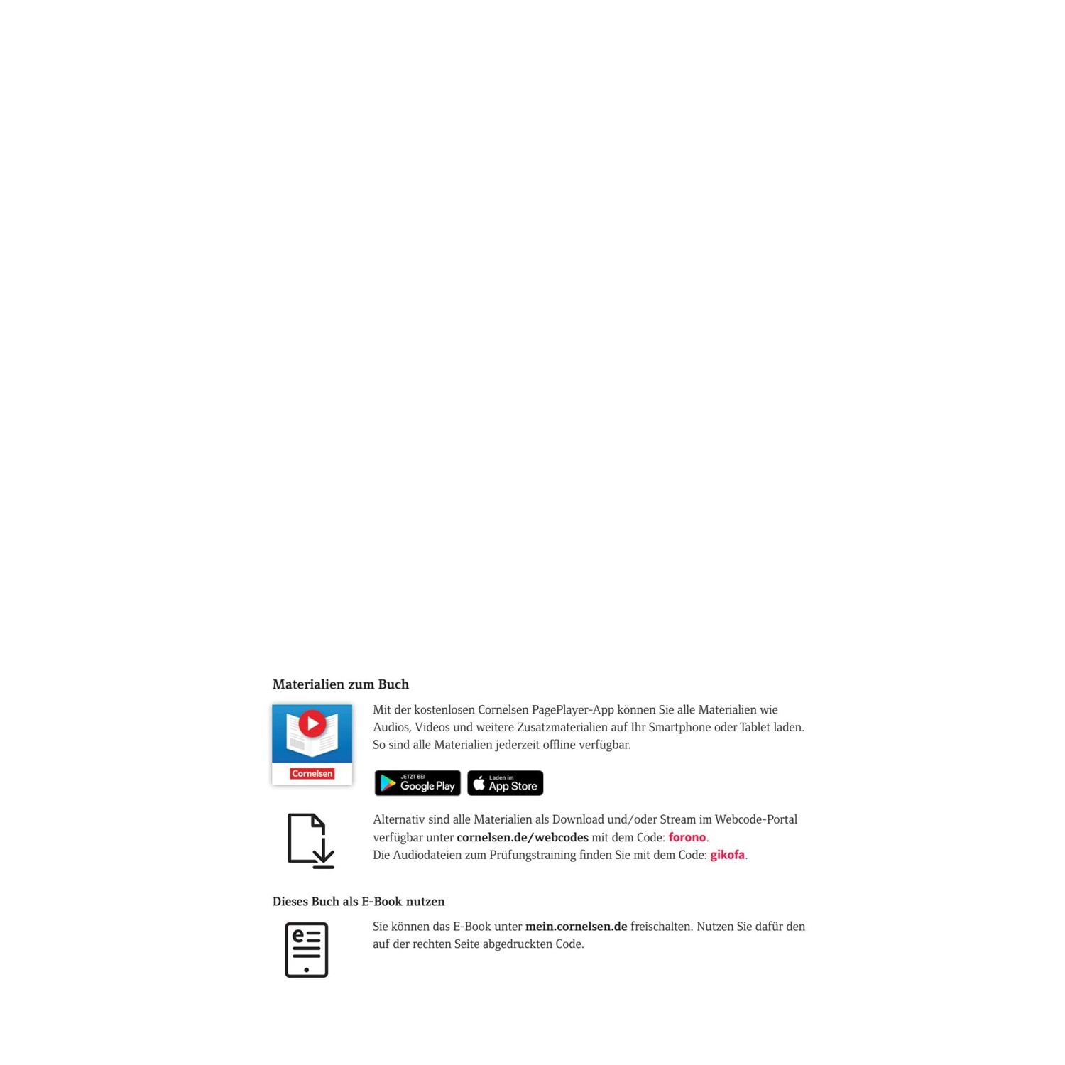 Alle Medien zum Lehrwerk wie Audios, Videos und interaktive Übungen können Sie über die kostenlose Cornelsen PagePlayer-App abspielen oder in den Webcodes auf cornelsen.de/codes streamen und herunterladen.