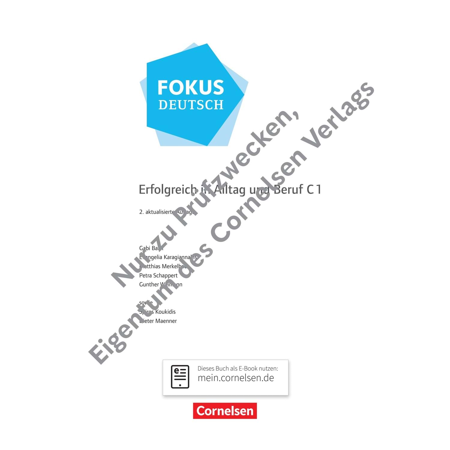 Das Lehrwerk Fokus Deutsch C1 bereitet fortgeschrittene Deutschlernende auf die Bewältigung komplexerer kommunikativer Aufgaben in Alltag und im Beruf vor und vermittelt Sprachkenntnisse, die für die Ausübung höher qualifizierter Berufe vorausgesetzt werden. Es ist vom BAMF für die Basisberufssprachkurse C1 zugelassen.